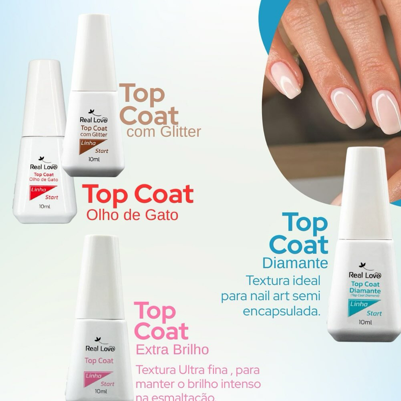 Com uma fórmula moderna, o Top Coat Tradicional Linha Start Real Love 10ml promove um acabamento espelhado, garantindo aquele toque final que transforma qualquer manicure em uma obra-prima. Sua textura fluida e de fácil aplicação proporciona uma cobertura uniforme, sem bolhas, manchas ou resíduos. Ele é o segredo das unhas com aparência de salão, perfeitas, brilhantes e resistentes. Compatível com todos os tipos de gel, esmalte em gel e técnicas de alongamento, o produto se tornou um dos mais queridos pelas profissionais que buscam qualidade e resultado superior.
