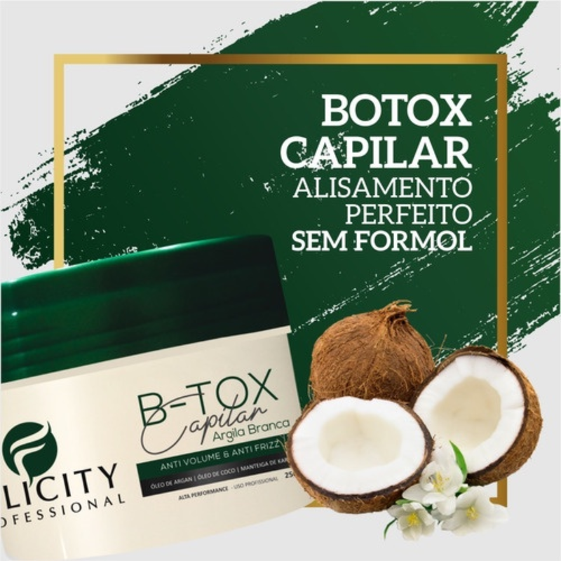 OBtox Argila Branca Felicity Professional 250gpromove aos fios Hidratação Profunda, Nutrição, Brilho e Maciez além de proporcionar alinhamentos dos fios com0% de Formol.Ageeliminando o frizz, proporcionando umliso naturale rico em propriedades hidratantes e nutritivas, que seu cabelo necessita para ser saudável. Além disso, reconstitui a estrutura dos fios e repõe a massa perdida.Não possui cheiro forte, não faz fumaça e não provoca ardência no couro cabeludo.Indicação:Cabelos Ondulados, rebeldes, crespos e com frizz, que necessitam de hidratação e redução de volume.Compatível com qualquer tipo de cabelo*Pode ser aplicado em cabelos com luzes*Tecnologia:Óleo de Argan:Composto natural rico em vitaminas A e E e ômegas 6 e 9, que são absorvidos instantaneamente por todos os tipos de cabelos, proporcionando sedosidade e brilho luminoso.Óleo de Coco:Sistema reparador que age na estrutura dos fios, recuperando a fibra capilar. Rico em vitamina E, fortalece e cria uma película protetora nos fios.Manteiga de Karité:Rica em ácidos graxos, possui alto poder de hidratação, garantindo brilho, controle e força para os fios.Benefícios:- Antifrizz;- Maciez;- Brilho intenso;- Sedosidade;- Ultra Hidratante;- Efeito redução de volume;- Alinhamento da fibra capilar.Resultado:Alinhamento da fibra capilar deixando os cabelos com efeito de liso natural, sem volume e frizz. Além de sedosidade e brilho intenso aos fios;*O resultado do produto pode variar dependendo do tipo, estado e condições do cabelo.Modo de uso:- Lave os cabelos com um shampoo pré-tratamento antirresíduo;- Seque completamente os cabelos com uma toalha. Separe o cabelo em partes;- Com o auxílio de um pente e pincel, inicie o processo de aplicação do Btox Argila Branca Zero por todo o comprimento dos fios em mechas finas, respeitando 1cm da raiz;- Deixe o produto em pausa sobre os fios, de acordo com estrutura do cabelo(de 20 minutos para cabelos levemente ondulados, até 30 minutos para cabelos mais resistentes);- Após o tempo de pausa, remova o excesso com pente ou leve enxágue,removendo 50% do produto (para cabelos loiros ou coloridos, remover 70%);- Seque 100% os cabelos, com escova e secador;- Finalize com prancha, 10 a 15x cada mecha, em temperatura entre 200 e 230ºC (390 a 440ºF);- Após finalizar, lave os cabelos, removendo qualquer vestígio do produto;- Pode ser aplicado condicionador ou máscara de hidratação;- Seque apenas com toalha e secador e finalize como desejar.Lavar os cabelos nos dias posteriores com shampoos de pH abaixo de 5,5.