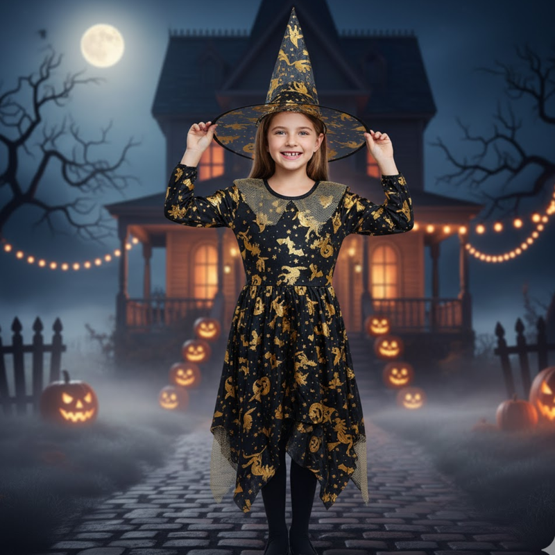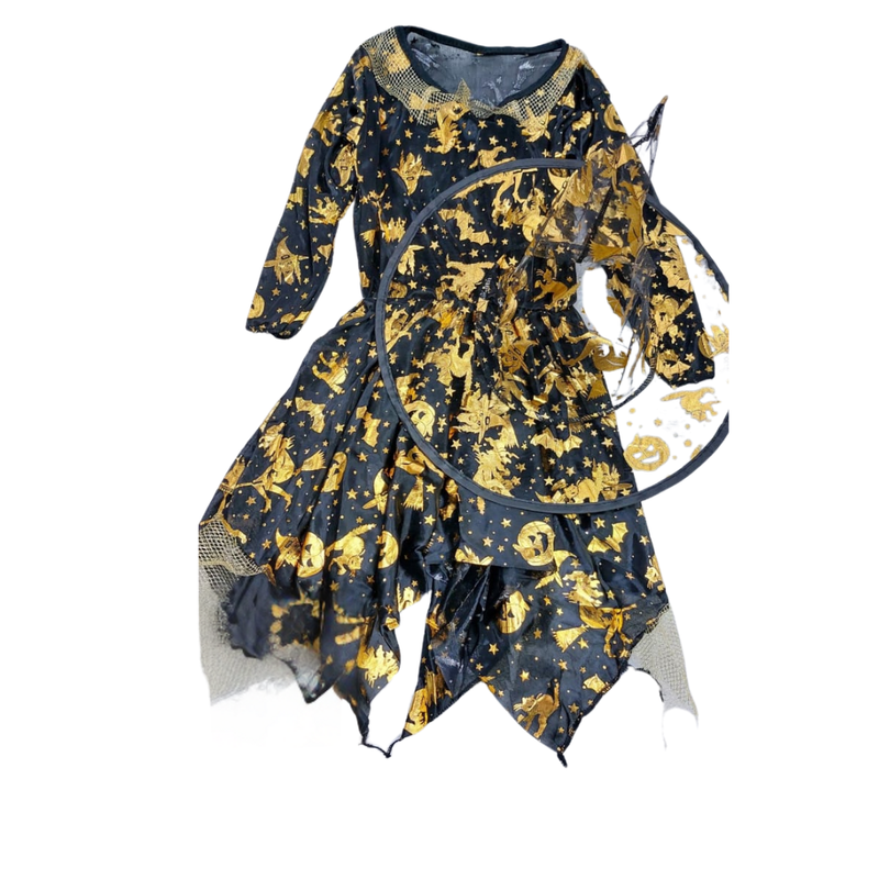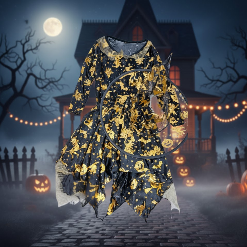 Vestido de Bruxa: Preto com estampas douradas, mangas longas e detalhes na gola. A barra em formato pontudo e o tecido esvoaçante dão um toque dramático.