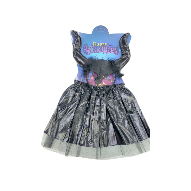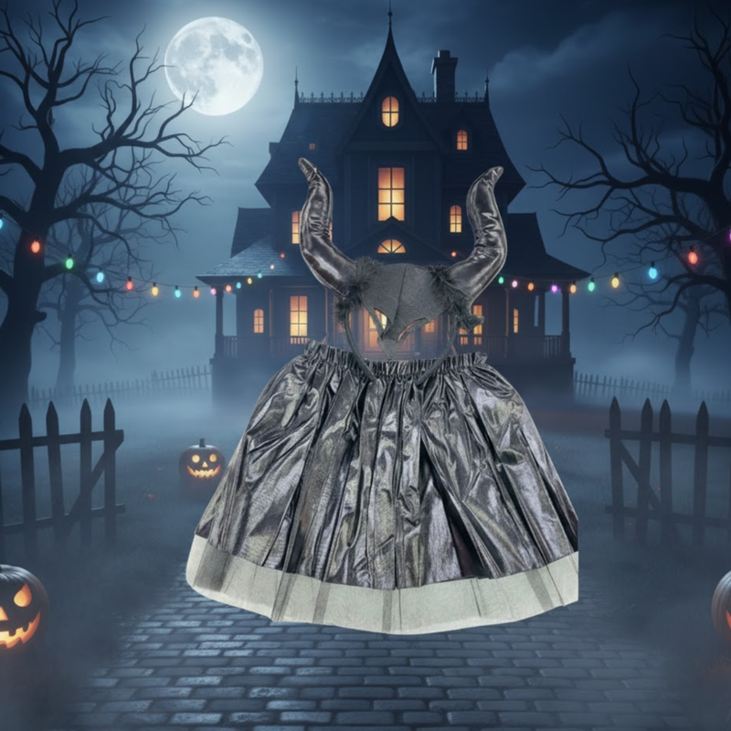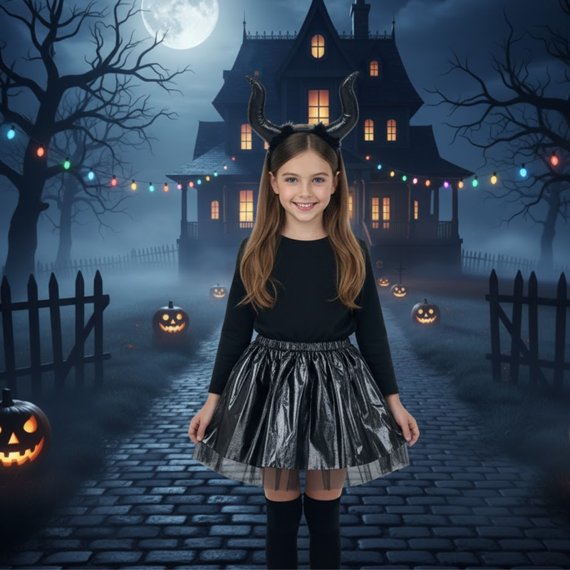 Este kit de fantasia de Diabinha é a escolha perfeita para quem busca um look divertido, moderno e com muito brilho. A saia metalizada prateada e a tiara de chifres pretos são ideais para criar uma personagem única no Dia das Bruxas, Carnaval ou festas a fantasia.