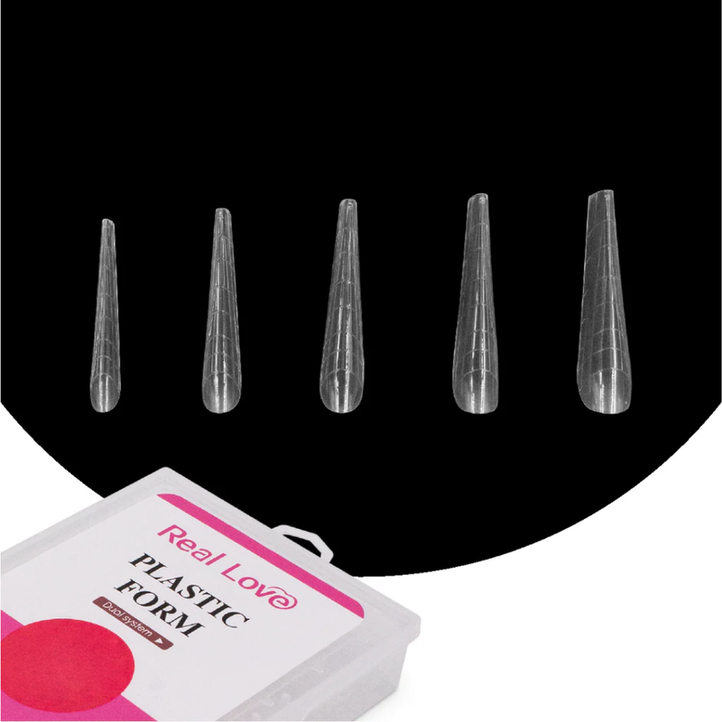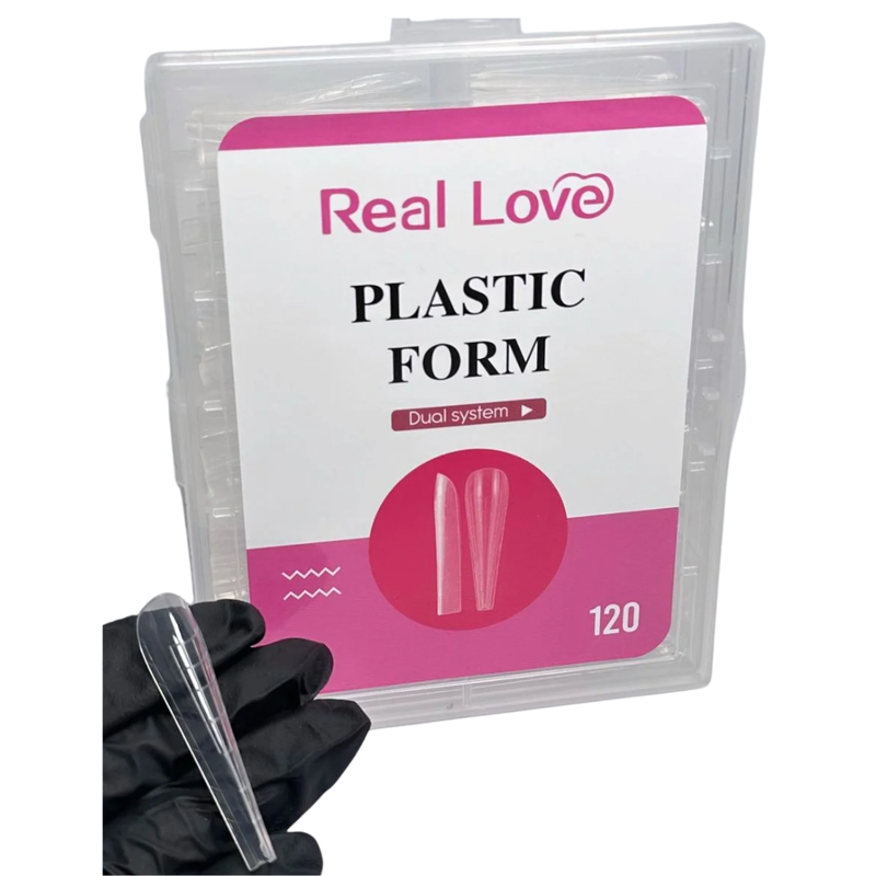 Plastic Form Real Love, molde para alongamento de unhas, dual system tips, unhas de gel, unhas polygel, unhas acrílicas, molde reutilizável unhas, caixa com 120 unhas Real Love, unhas postiças profissionais, kit alongamento unhas.
